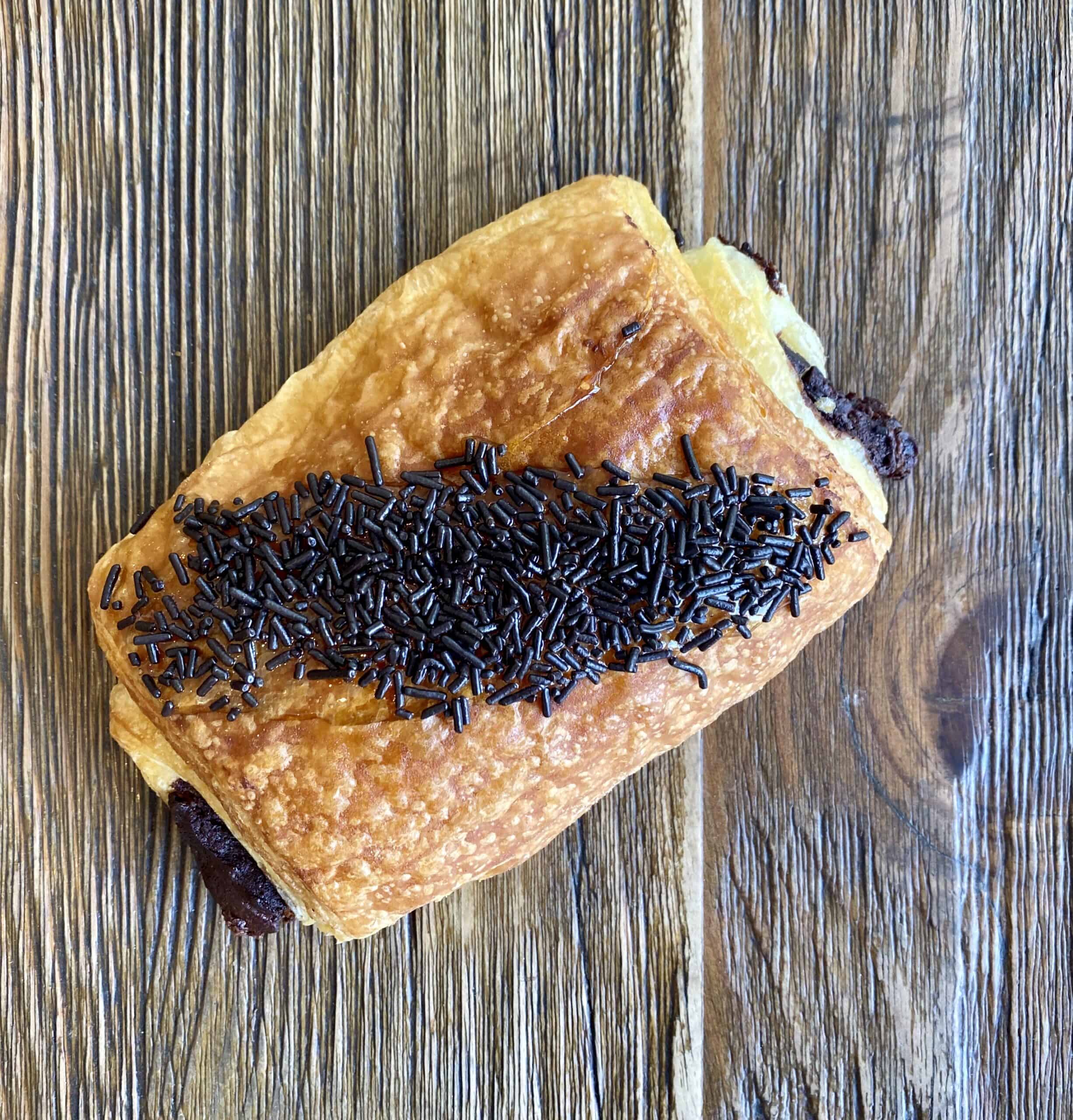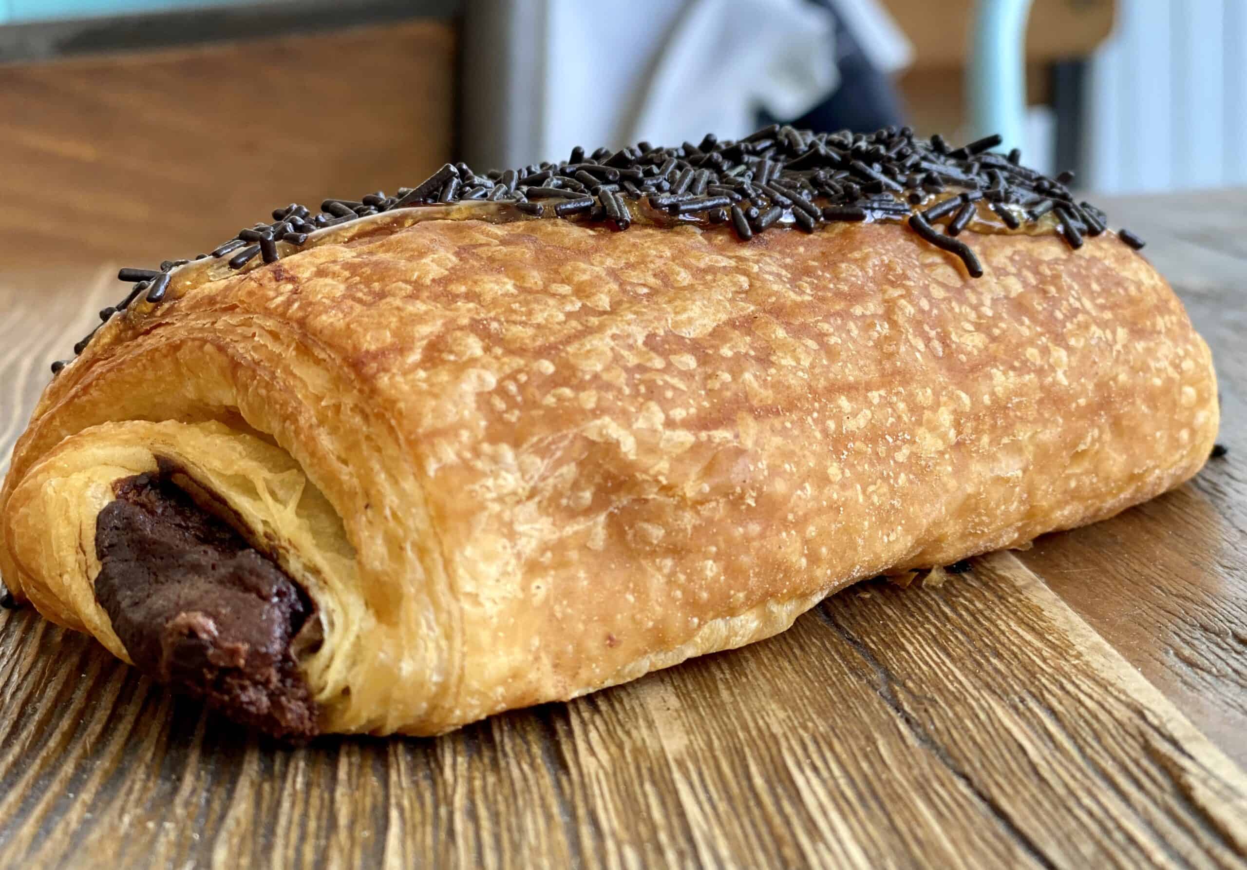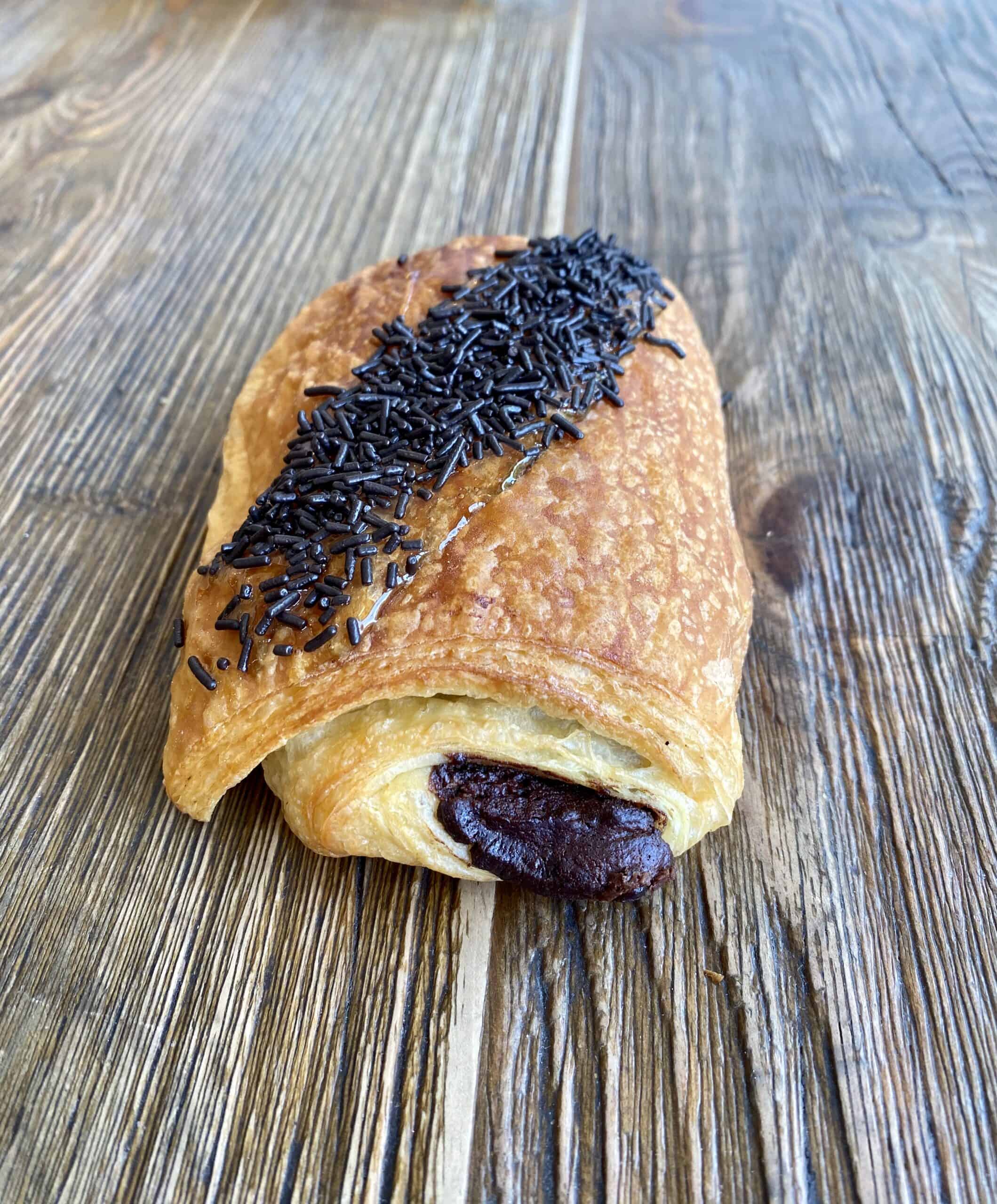 Napolitana de hojaldre con relleno de crema de chocolate y virutas de chocolate por encima
