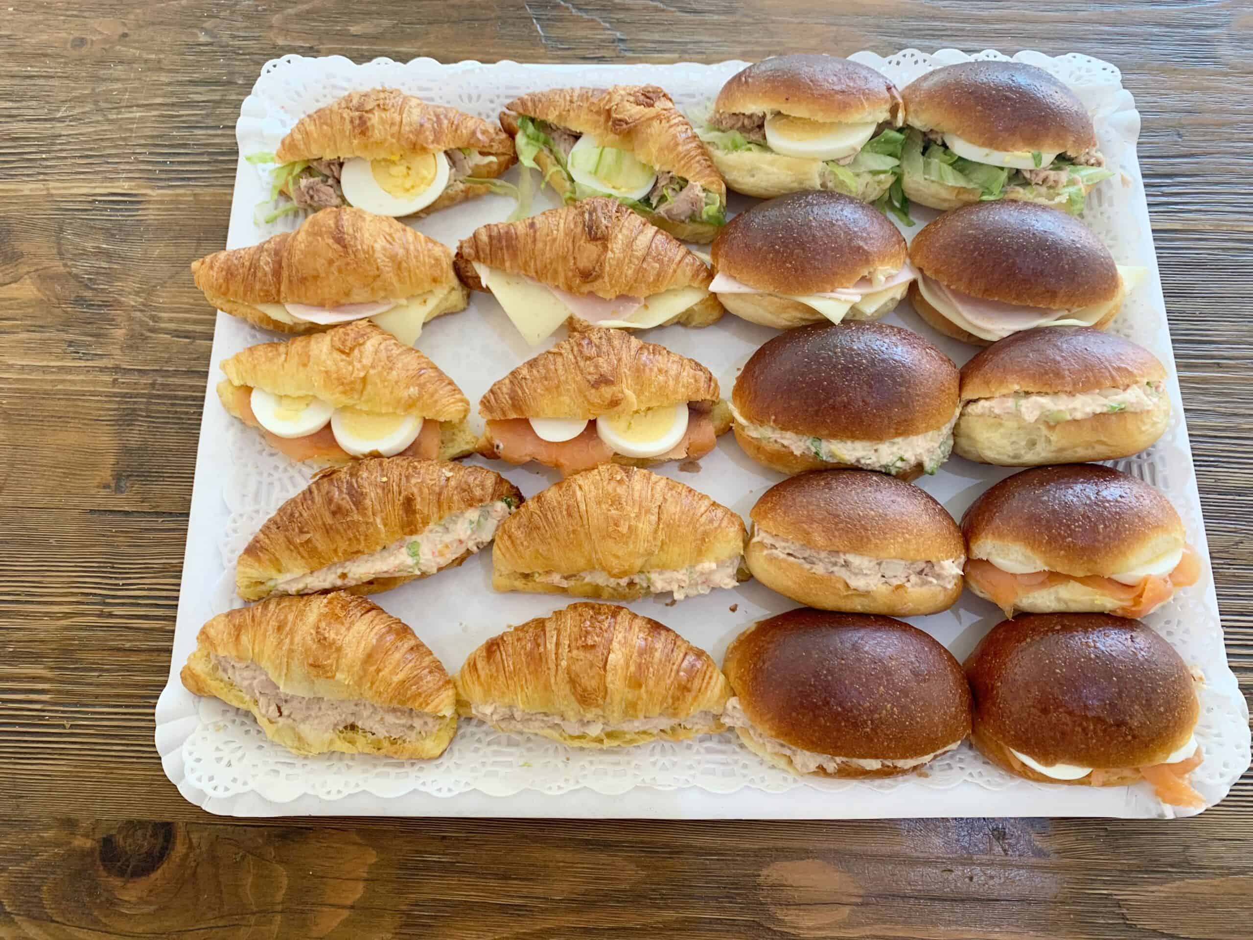 1) Pequeño: 5 Sandwiches variados, 5 mediasnoches rellenas y 5 minicroissants rellenos